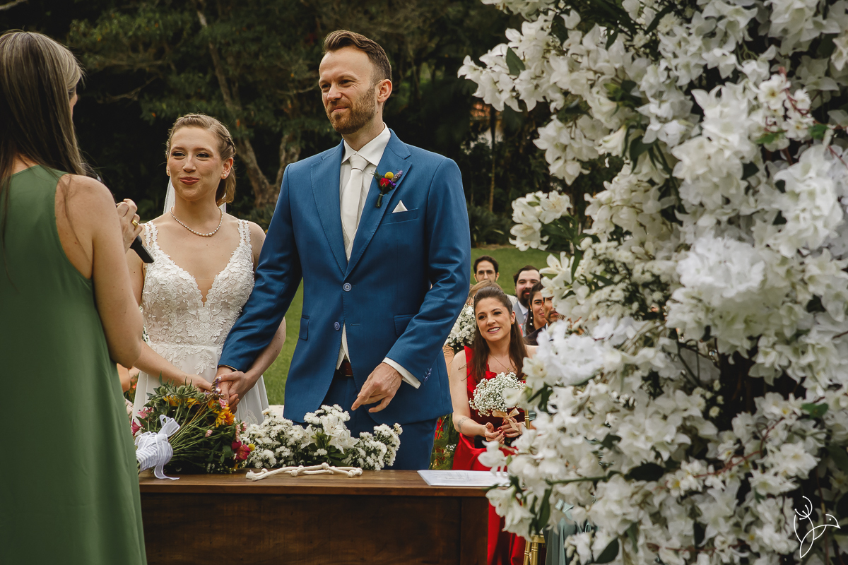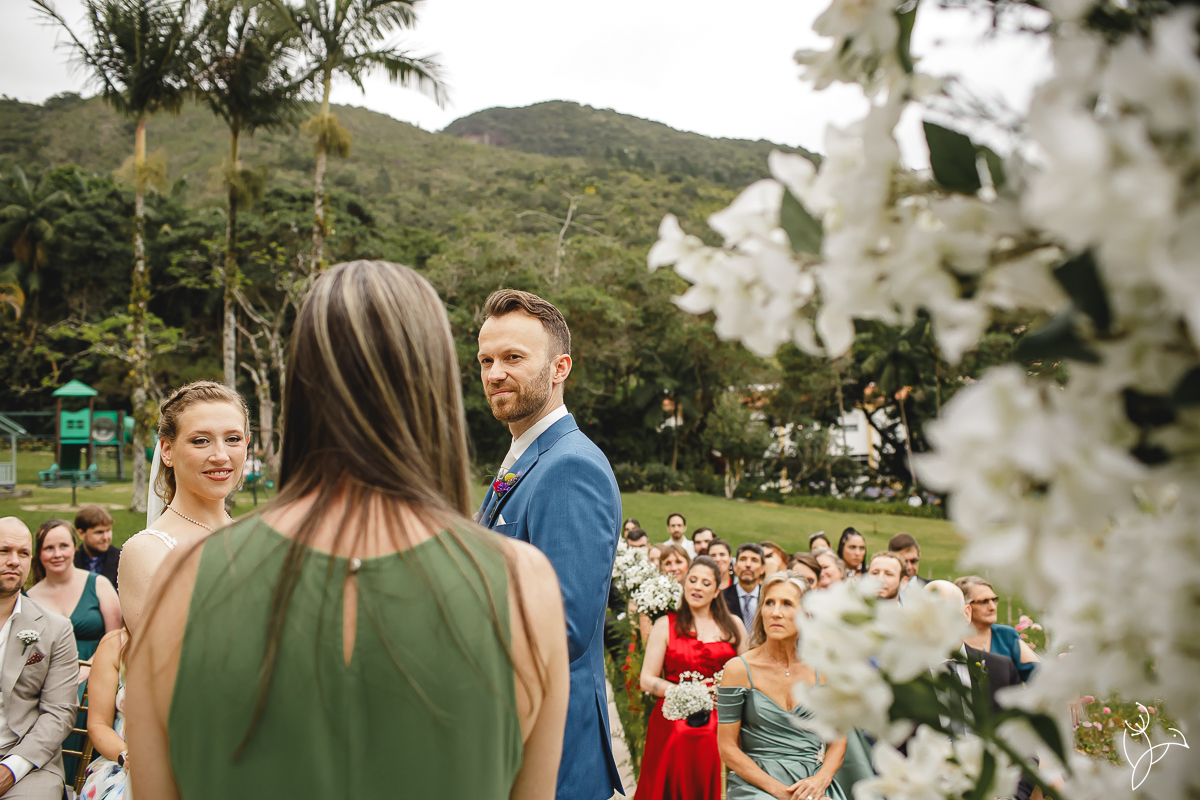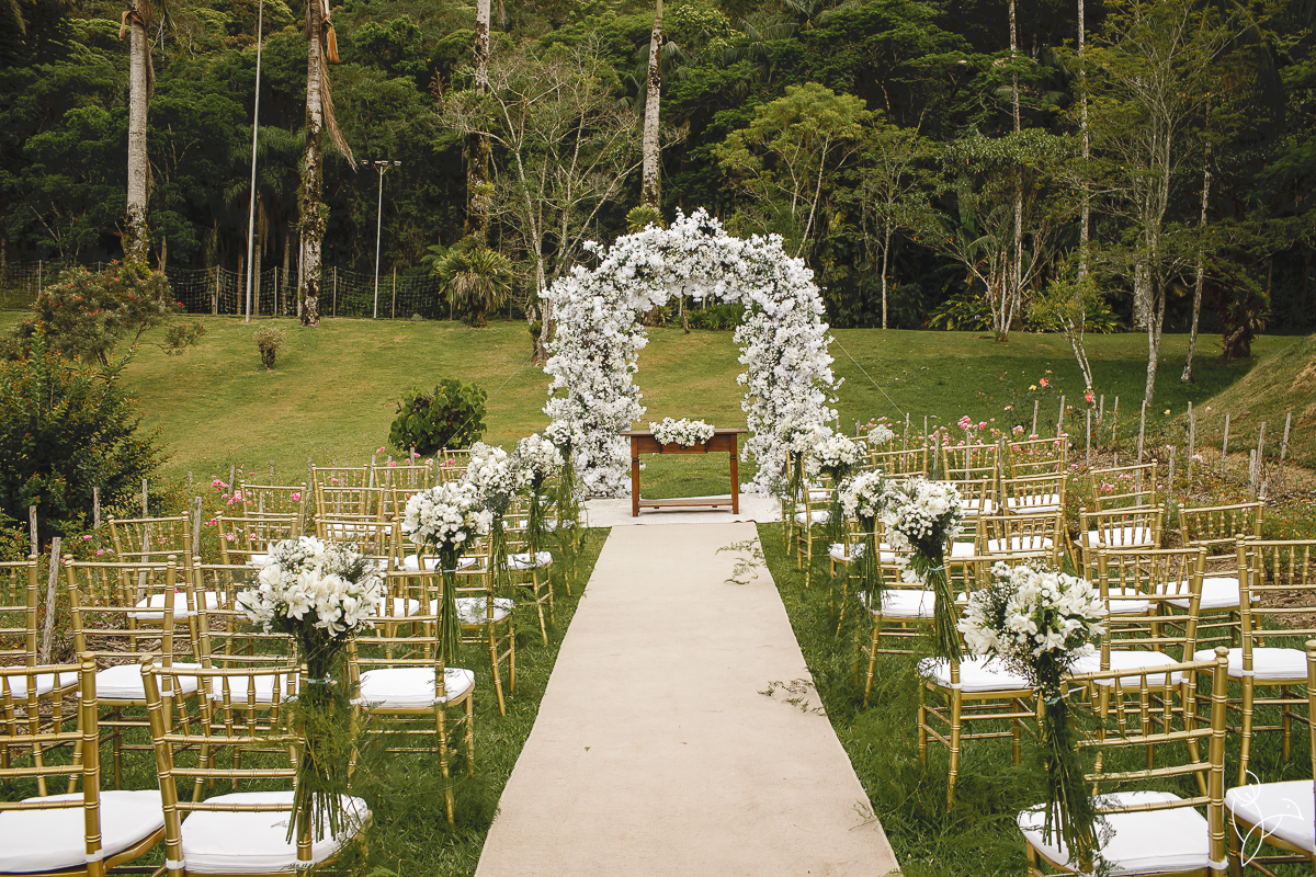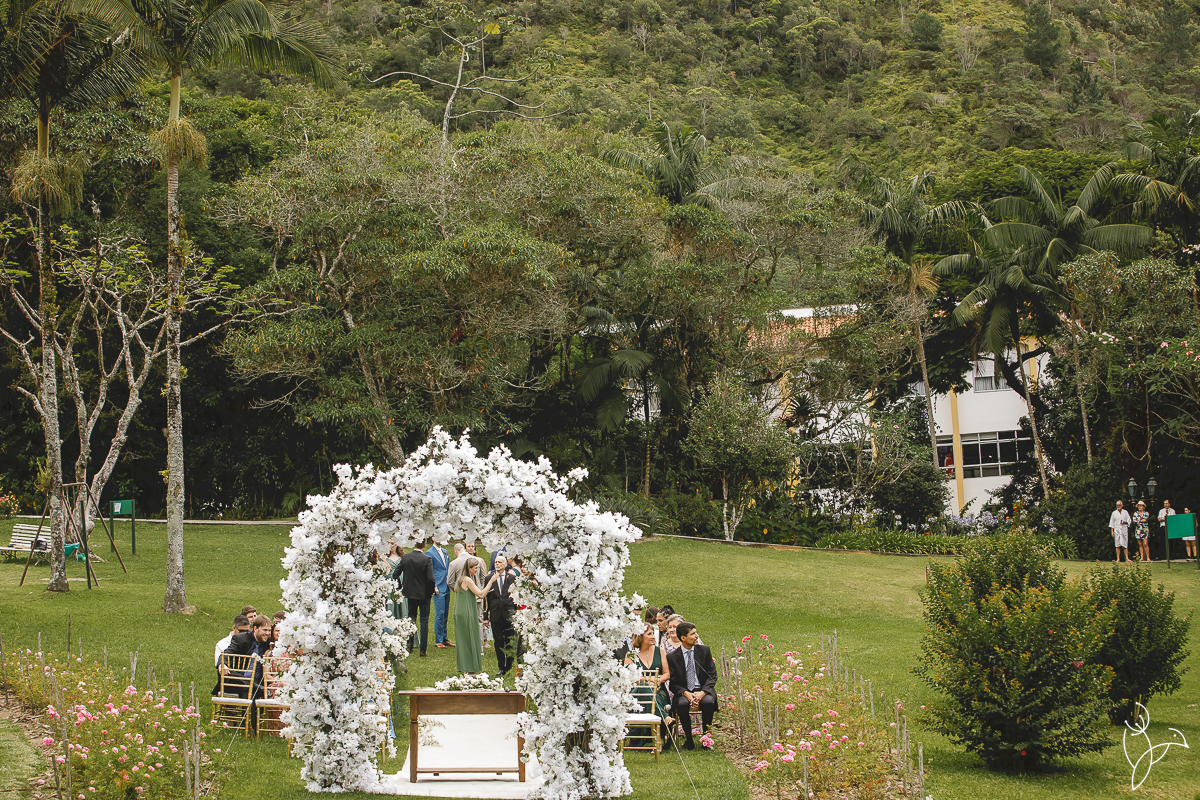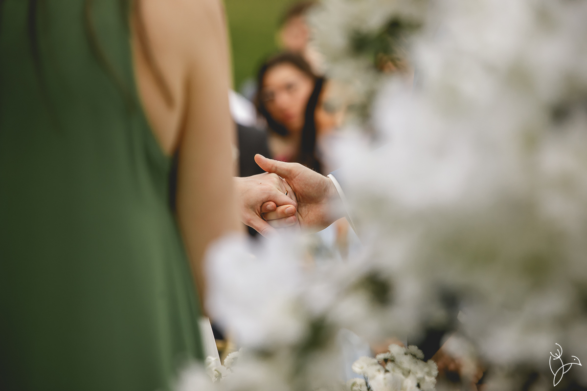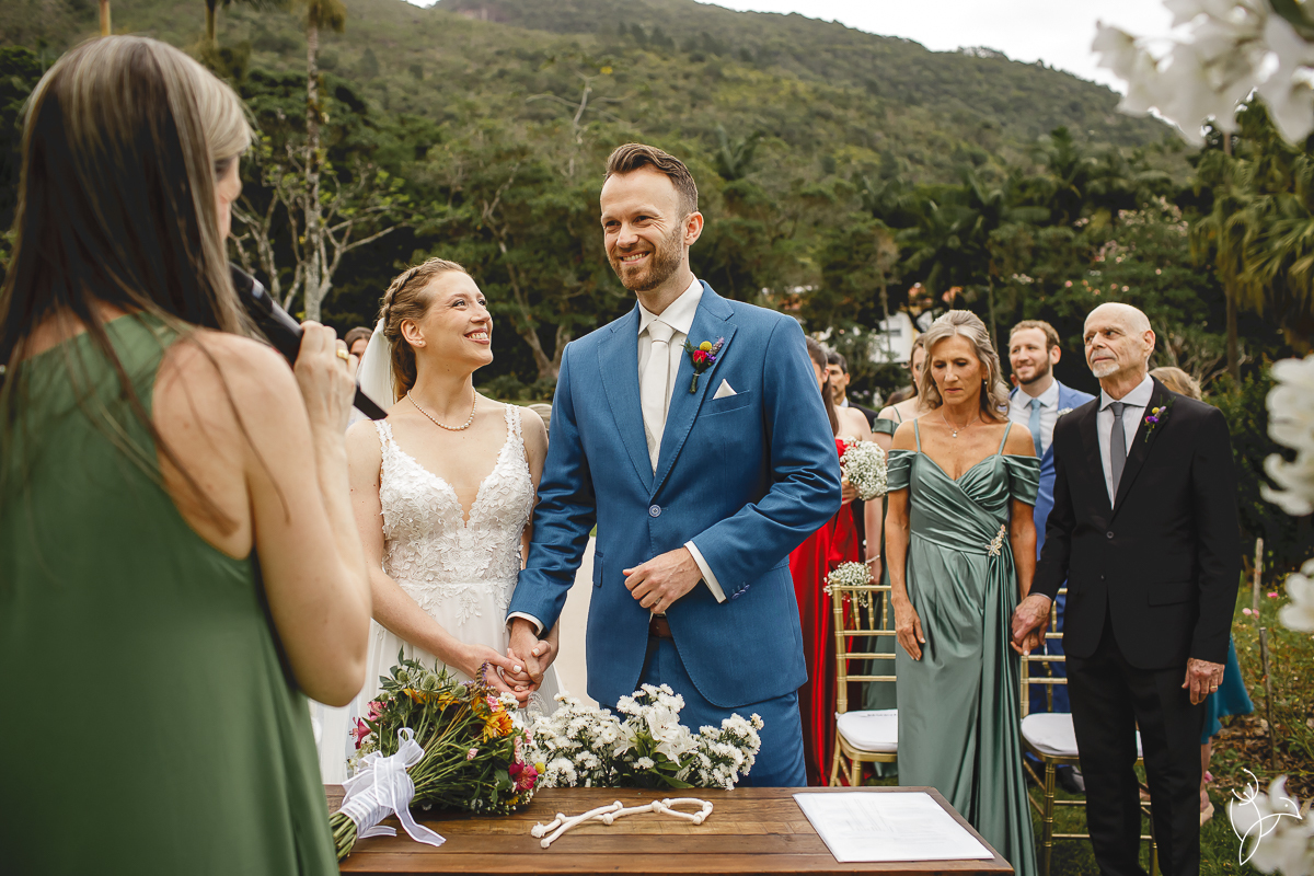 A cerimônia aconteceu no gramado do resort, rodeado pelo verde da natureza e pela tranquilidade do lugar.