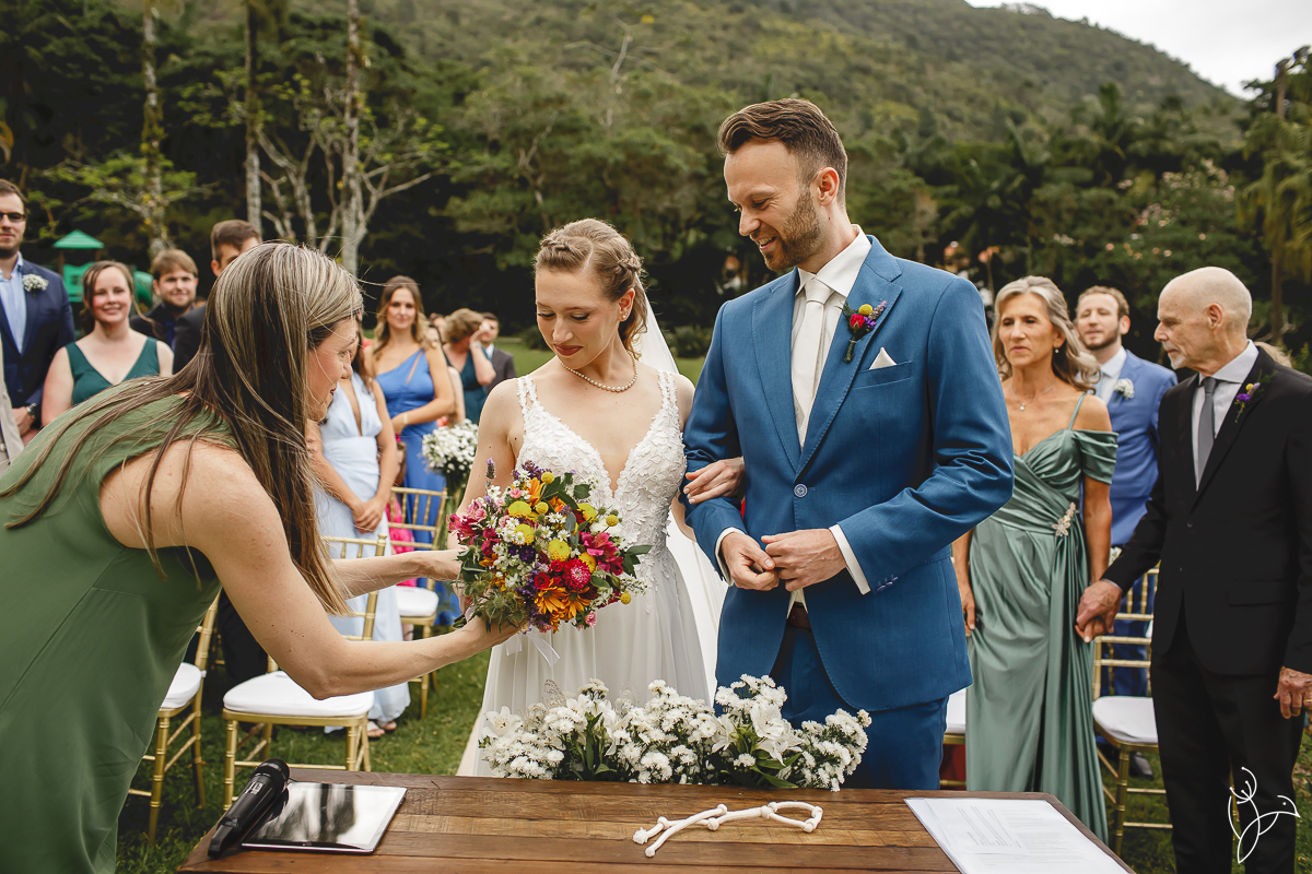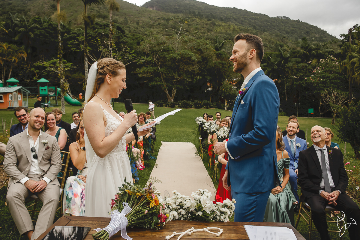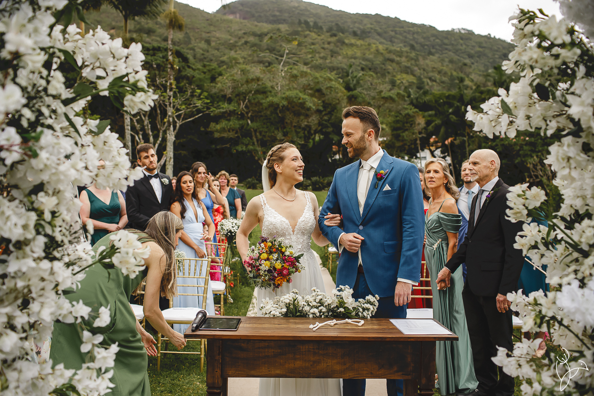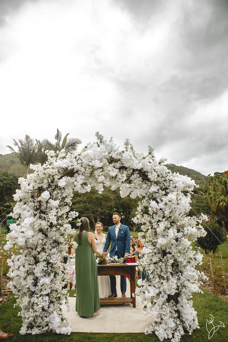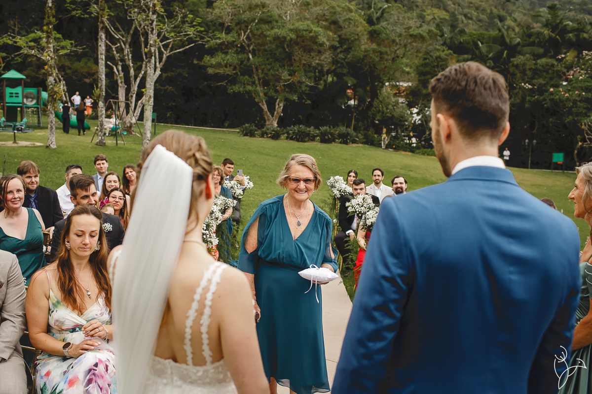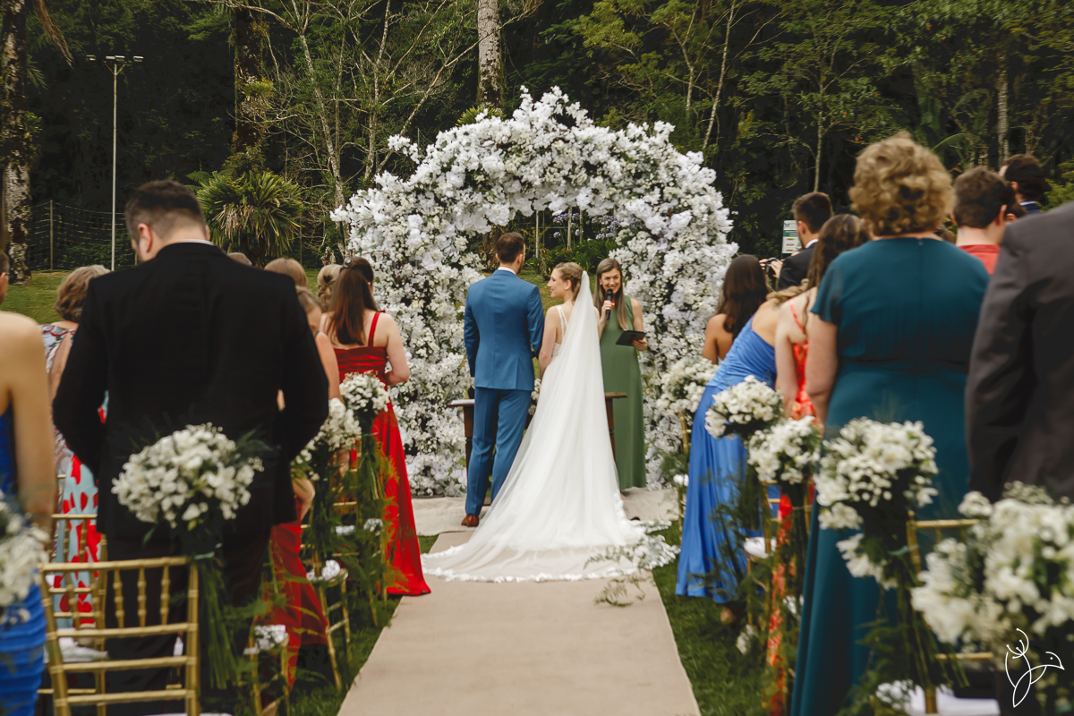 A cerimônia aconteceu no gramado do resort, rodeado pelo verde da natureza e pela tranquilidade do lugar.