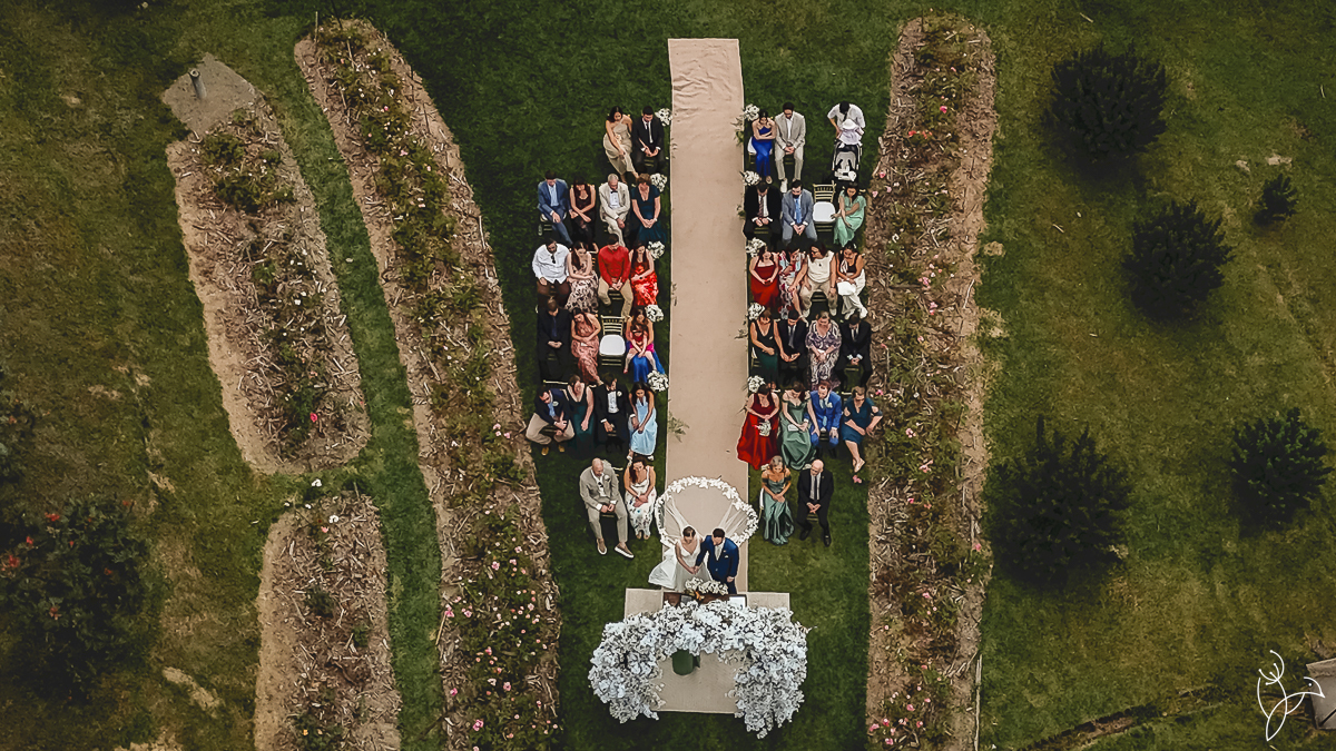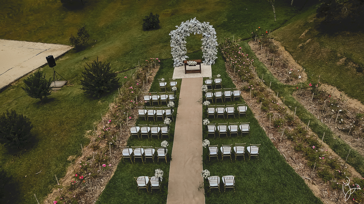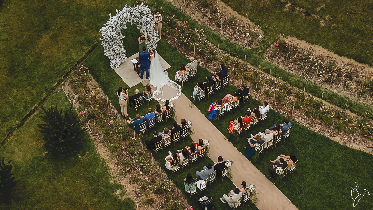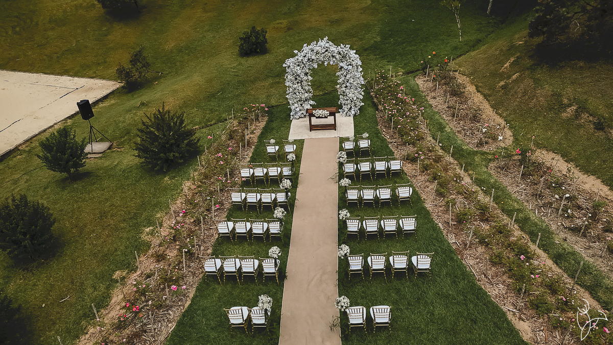 Também realizamos registros aéreos com drone, revelando toda a beleza da decoração e do cenário do casamento visto de cima.