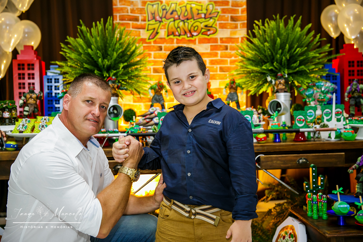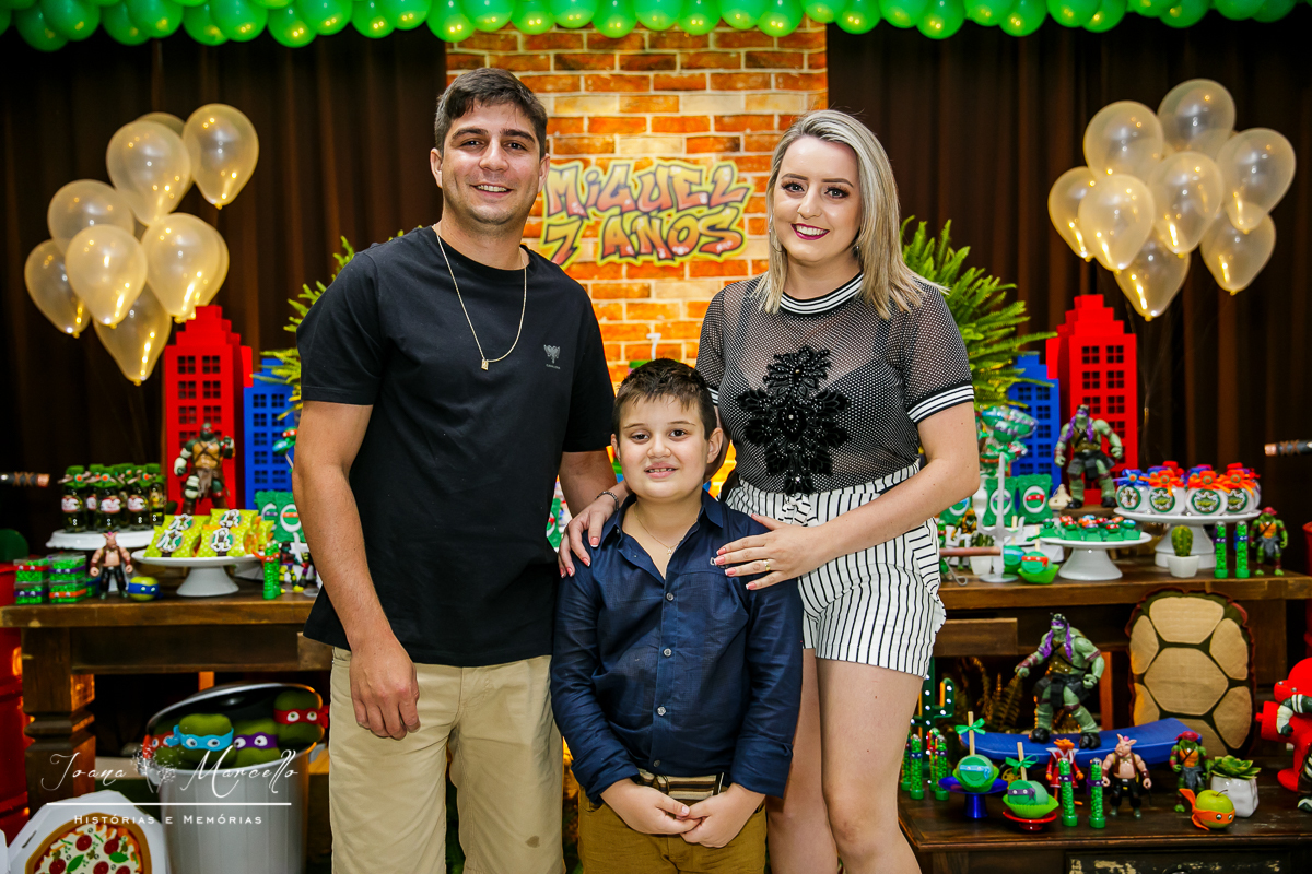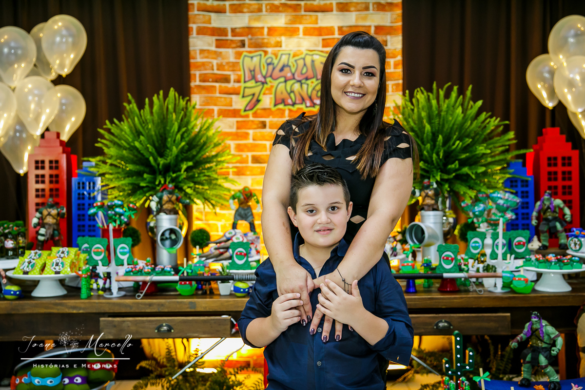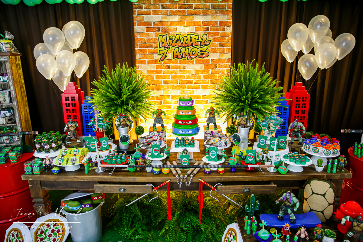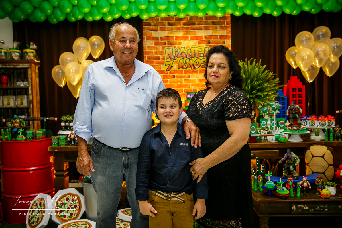 Mas agora tudo é diferente, é o Miguel quem escolhe o tema e esse ano foram As Tartarugas Ninja quem ele quis em sua festa.